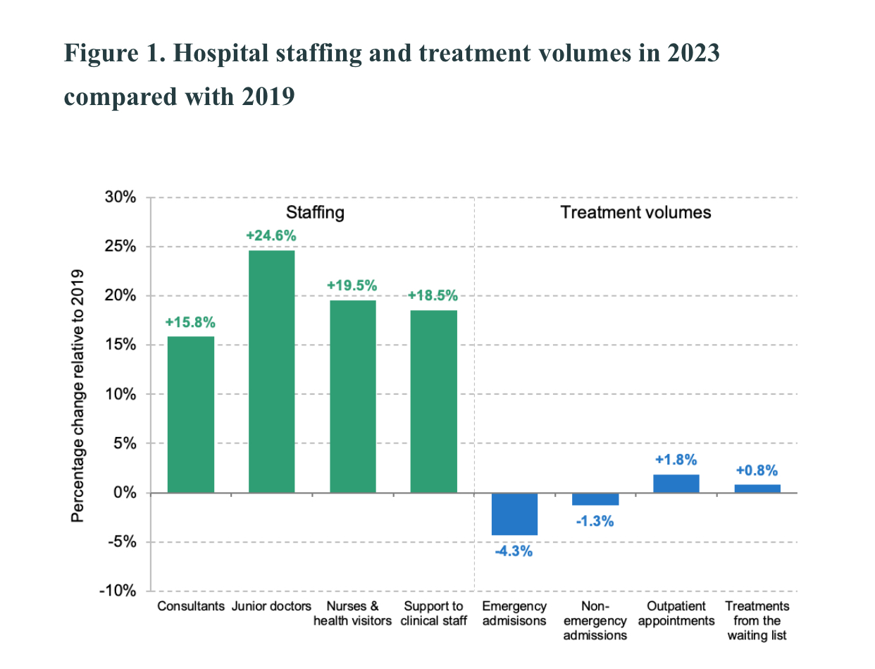 Everything everywhere in the NHS is about the productivity challenge. Sometimes, the narratives get trapped in what productivity means (1). It isn’t that complicated. Put simply, analysis per service, per Trust, per system, per the whole NHS, shows lower throughput of patients per pair of hands, per shift, per any denominator. This is not surprising when staff growth since 2019/20 is over 20% and treatment activity has remained basically flat – see graph below from the IFS. The NHS went from good value to poor value really fast.